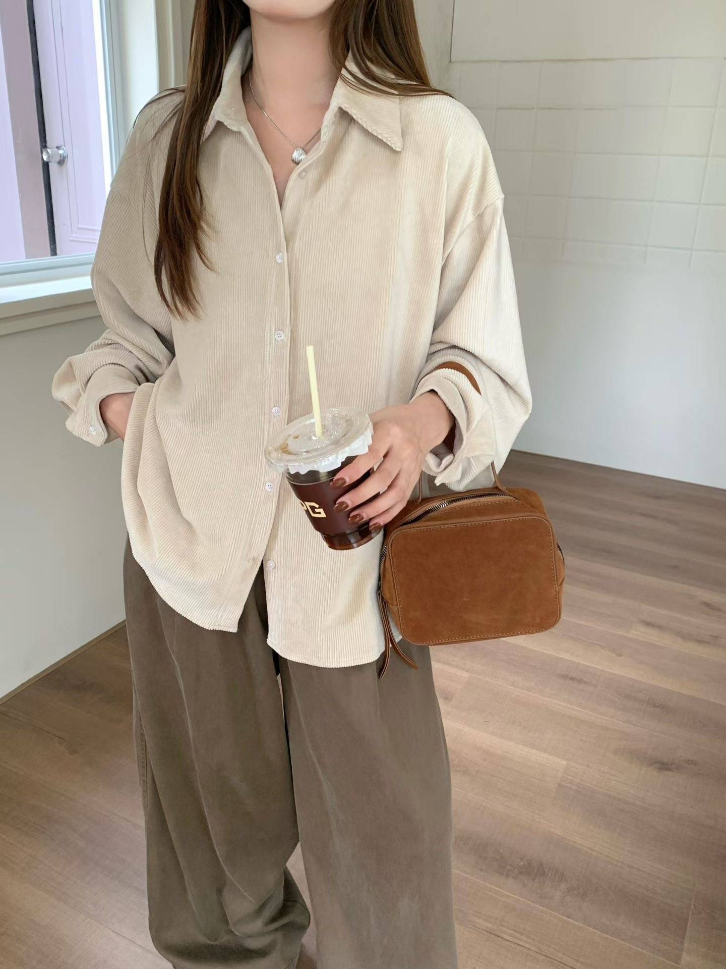 坑條絨大版襯衫,美人鞋窩