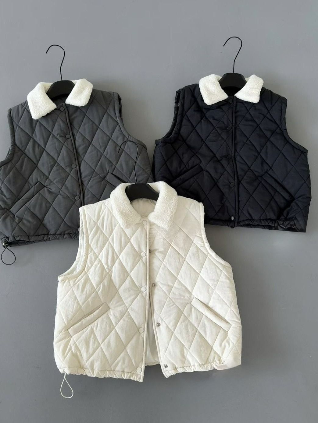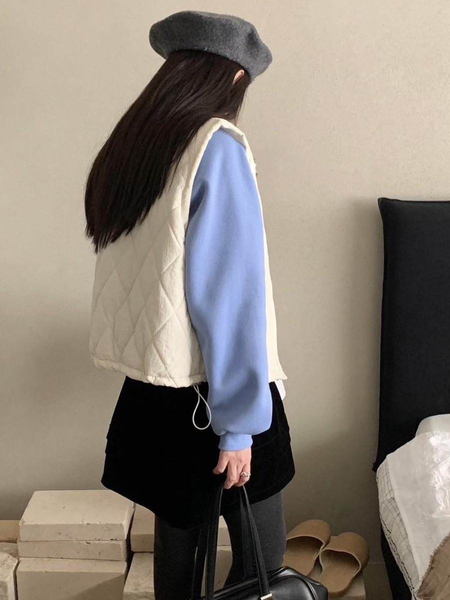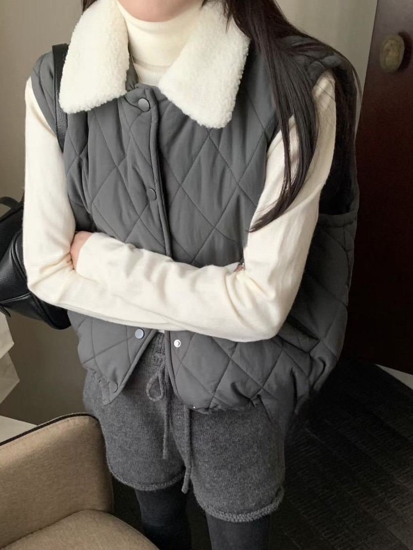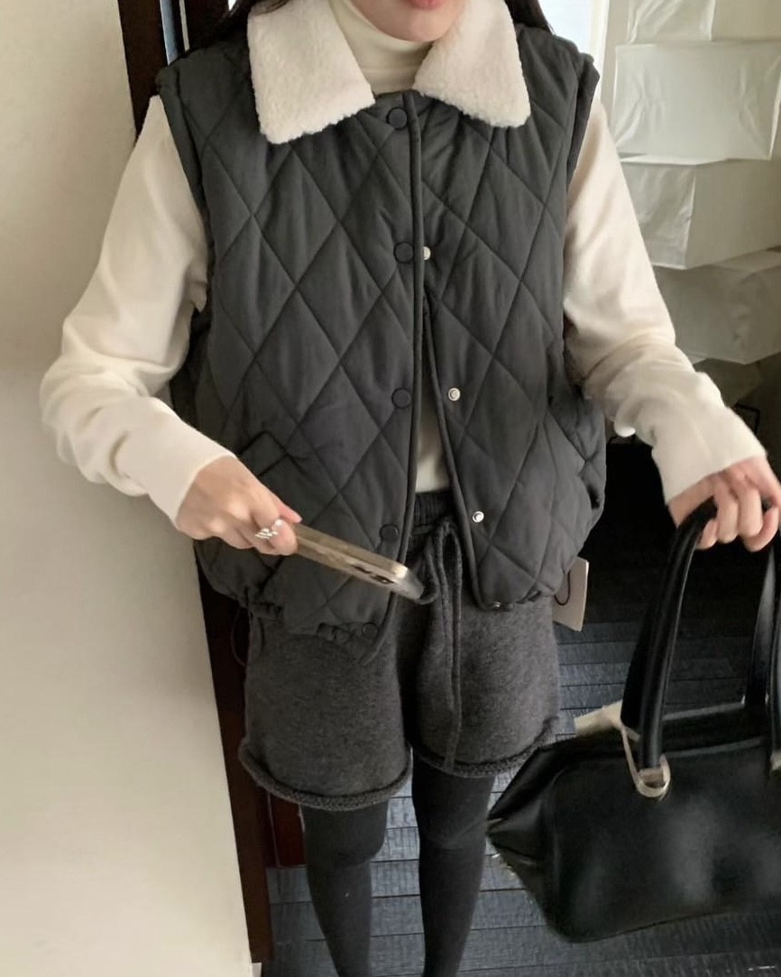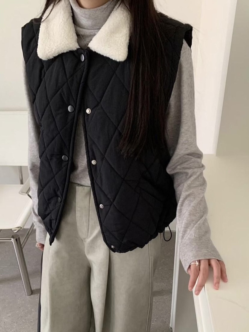 保暖毛領菱格鋪棉背心,美人鞋窩