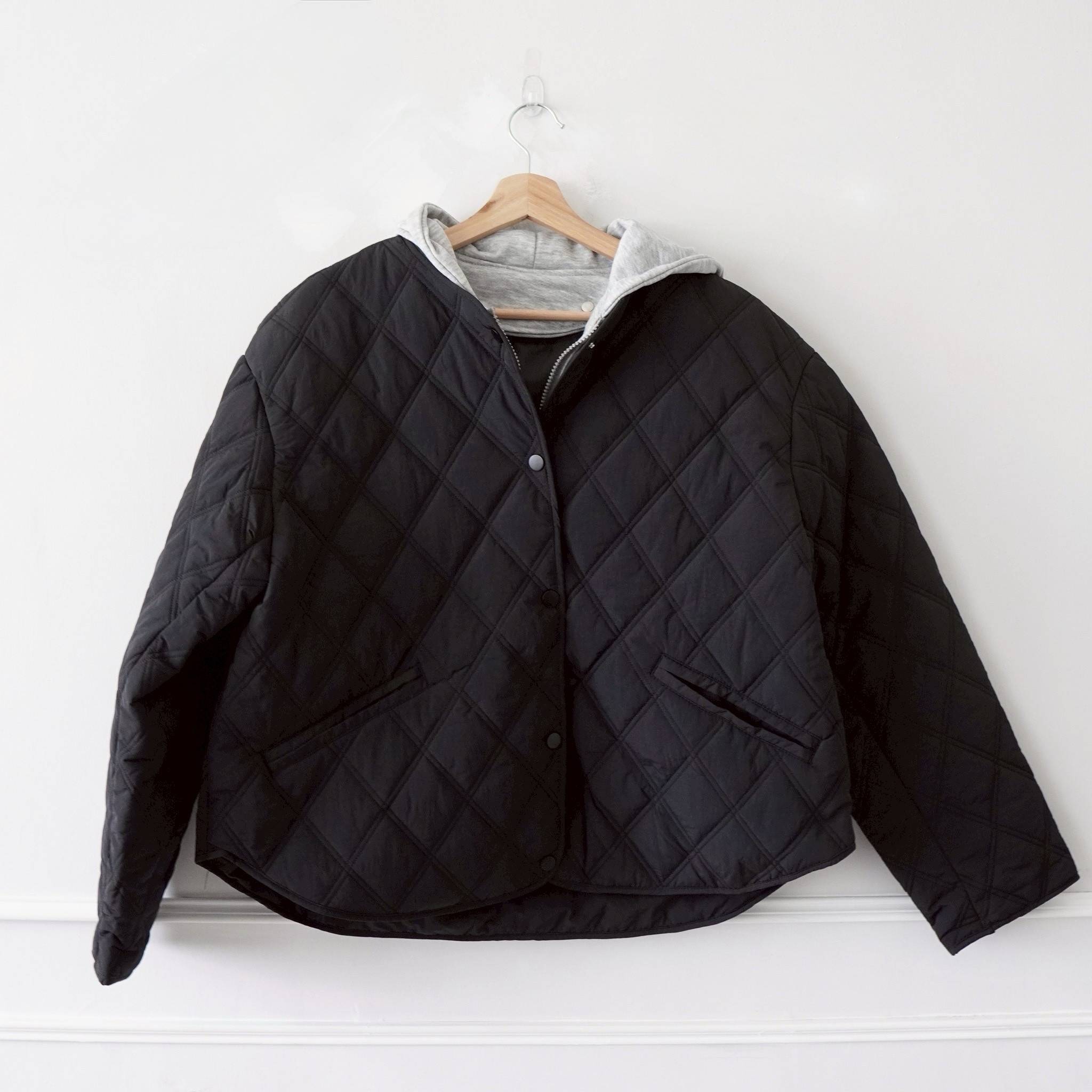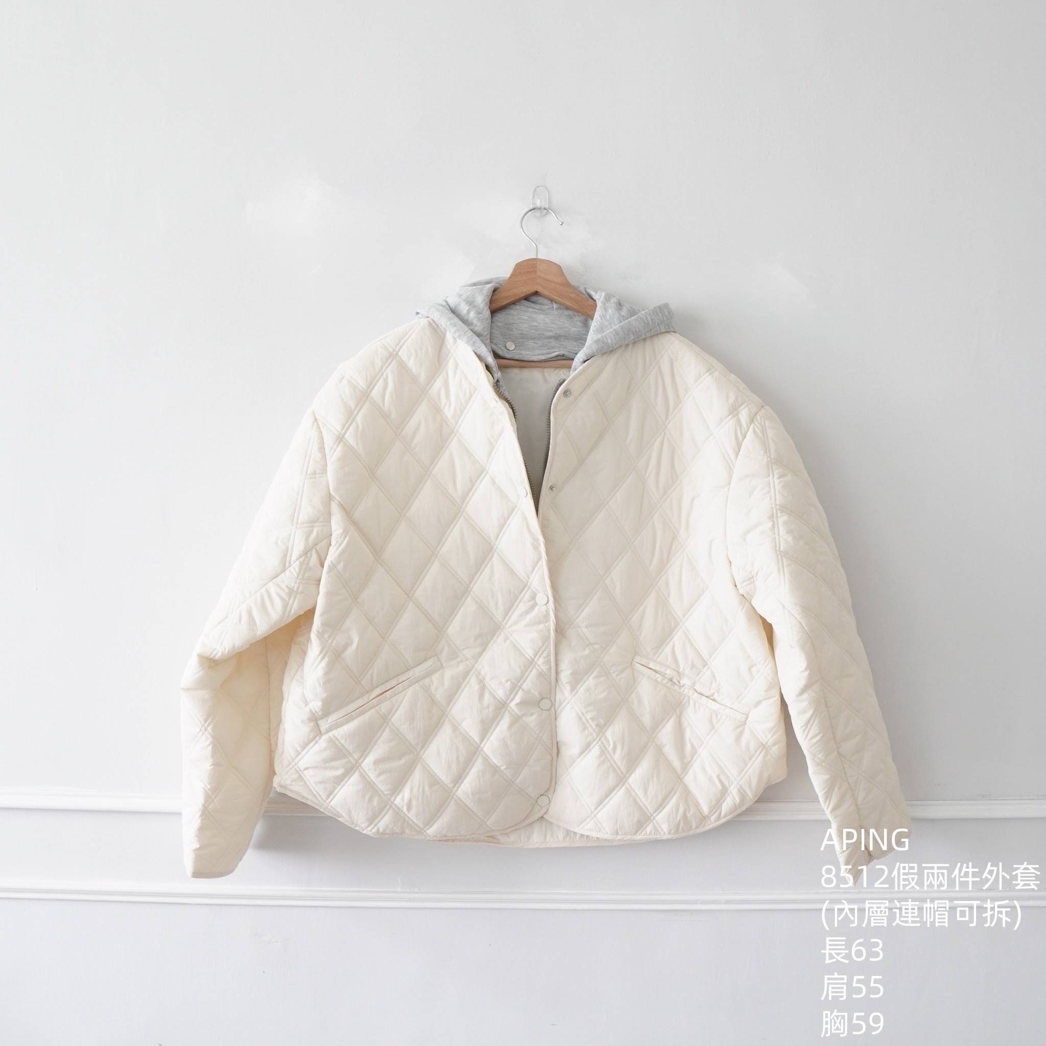 商品詳情 NEW 假兩件外套 (內層連帽可拆) 顏色:杏、黑、粉 長63 肩55 胸59 一件就能穿出層次感 外層是輕盈不厚重的菱格棉感布料 保暖又不會腫 內層是柔軟的棉質拉鍊連帽 拆下來單穿也很好看。 菱格車線鋪棉外套 TWD $1,125 TWD $900