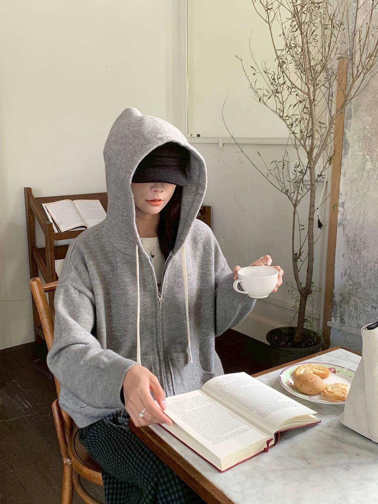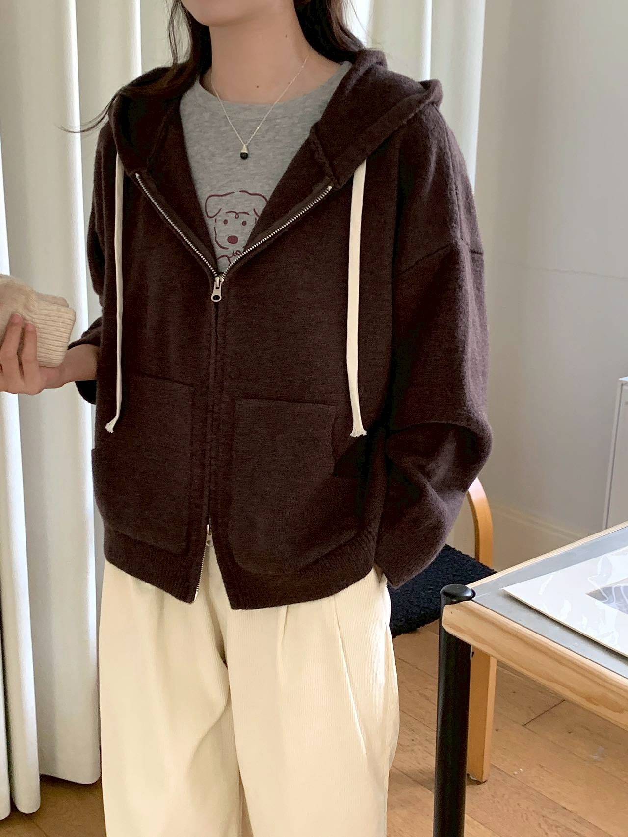 拉鍊連帽抽繩針織外套,美人鞋窩